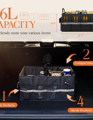 • Sale! HOTOR Foldable Trunk Organizer - SUV, Sedan & Van Compatible, Sturdy Base Panel for Car Accessories, Black, 2 Compartments, 21.3"12.6"10.6"